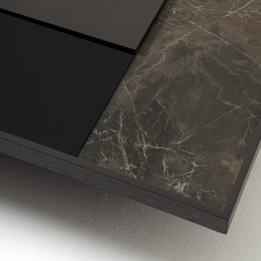 Der Tisch CRATE fällt mit seiner eleganten Form und dem modernen Still auf. Eine Marmorplatte und eine Platte aus gehärtetem Schwarzglas zieht die Aufmerksamkeit auf sich. Die hochwertige Eichenholz – Verarbeitung verleiht diesem Tisch eine ganz besondere Optik. Diese spielerische Farbkombination passt sich individuell jedem Wohnraum an.